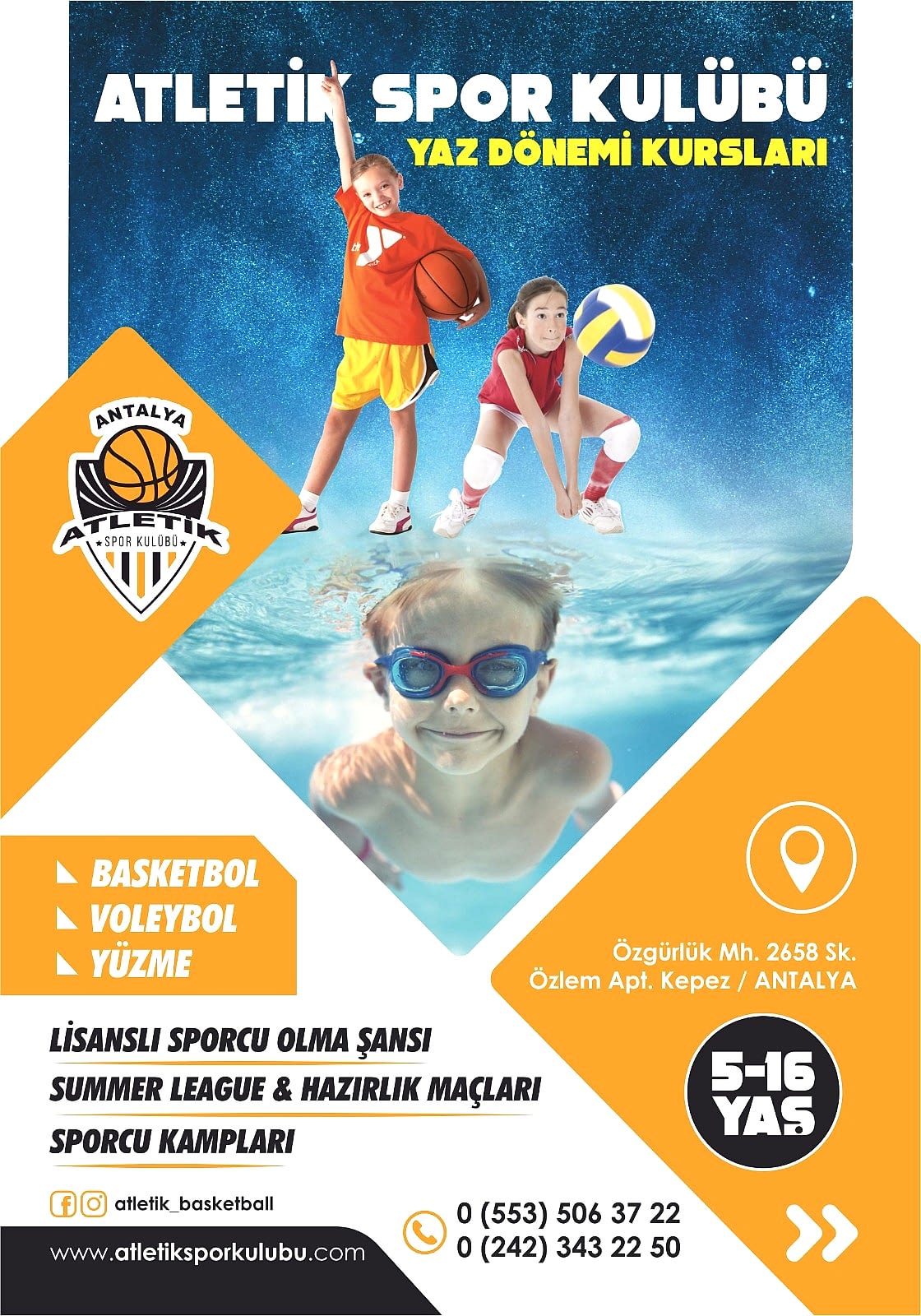 Konyaaltı , Muratpaşa ve Kepez bölgesinde faaliyet gösteren Basketbol, Voleybol ve Yüzme kursu kayıtlarımız başladı detaylı bilgi için bize ulaşın..